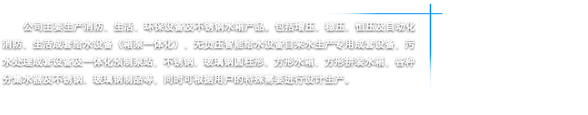 江蘇燁達環保設備有限公司坐落在江蘇省鹽城市建湖縣城,東臨黃海之濱,背倚蘇北平原,處于長三角經濟一體化和江蘇沿海開發兩個國家級戰略疊加區域內,素有“水鄉明珠”美稱。我公司鑒定走“產、學、研”相結合的路子,是江蘇省供水設備行業的大型企業。公司以“一流的管理,一流的研發設計,一流的質量意識,一流的售后服務”為宗旨,嚴格控制原材料質素,講求“品質是企業的生命力”的理念,嚴把質量關,從而為客戶提供優質的供水設備。公司主要生產消防、生活、環保設備及不銹鋼水箱四大類產品。包括增壓、穩壓、恒壓及自動化消防、生活成套給水設備(箱泵一體化),無負壓智能給水設備自來水生產專用成套設備,污水處理成套設備及一體化預制泵站,不銹鋼、玻璃鋼圓柱形、方形水箱、方形拼裝水箱,各種分集水器及不銹鋼、玻璃鋼制品等,同時公司可根據用戶的特殊需要進行設計生產。燁達人將以科學的管理、精湛的技術、可靠的質量、優良的品質向社會各界服務,我們始終坦誠相見,我們當然走在最前面······ |